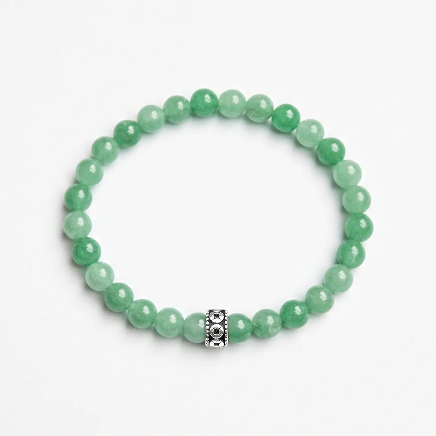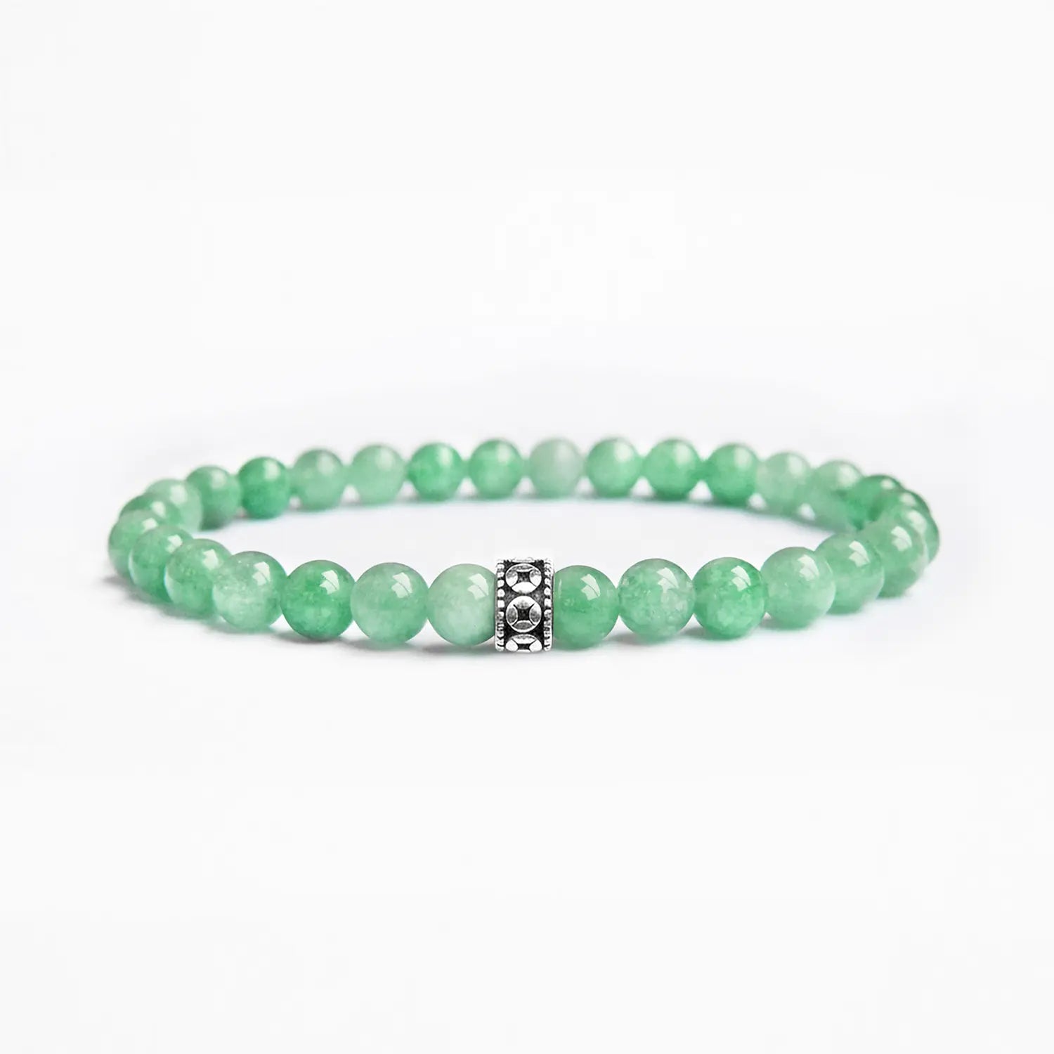 The refined middle ground—the 6mm bead offers a sophisticated, medium profile that is substantial enough to stand alone yet sleek enough to layer effortlessly. Blending hand-selected Green Aventurine beads with 925 sterling silver detailing.