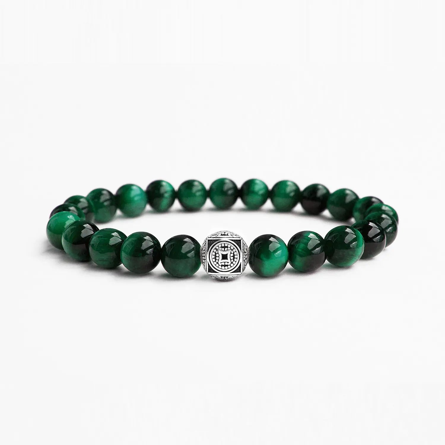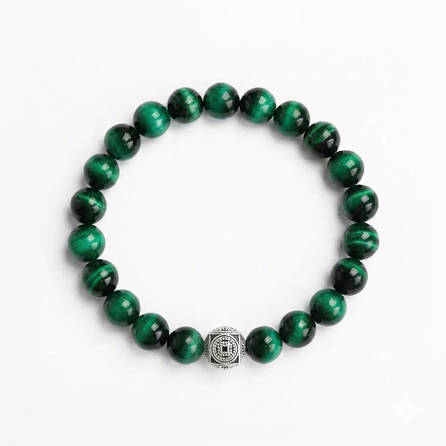 Blending the silky luster of Green Tigers Eye beads with 925 sterling silver detailing. Wear it solo as a standout piece, or let it anchor a stack of our smaller 4mm and 6mm bracelets.