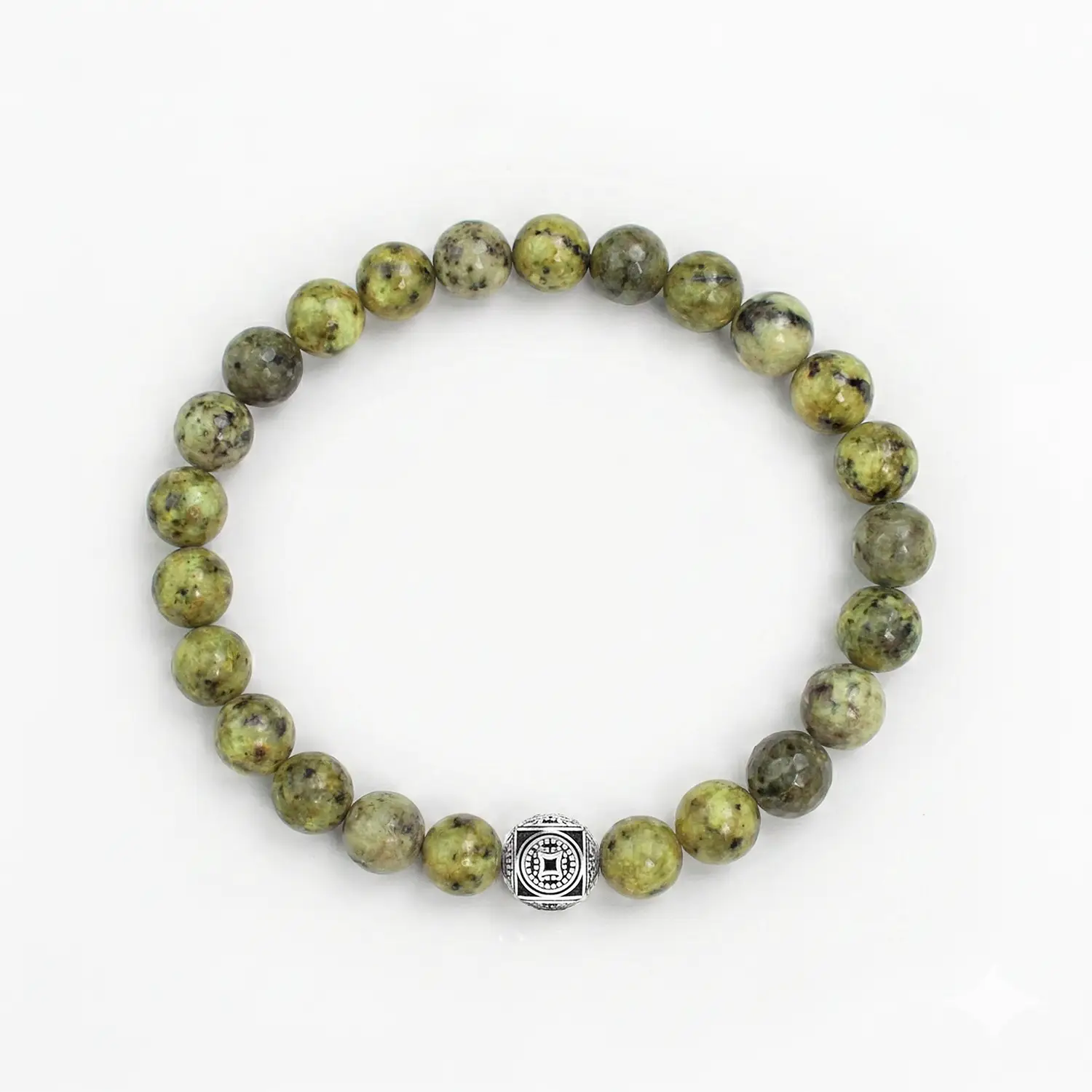 Blending the golden yellow tones of Imperial Jasper beads with 925 sterling silver detailing. Wear it solo as a standout piece, or let it anchor a stack of our smaller 4mm and 6mm bracelets.