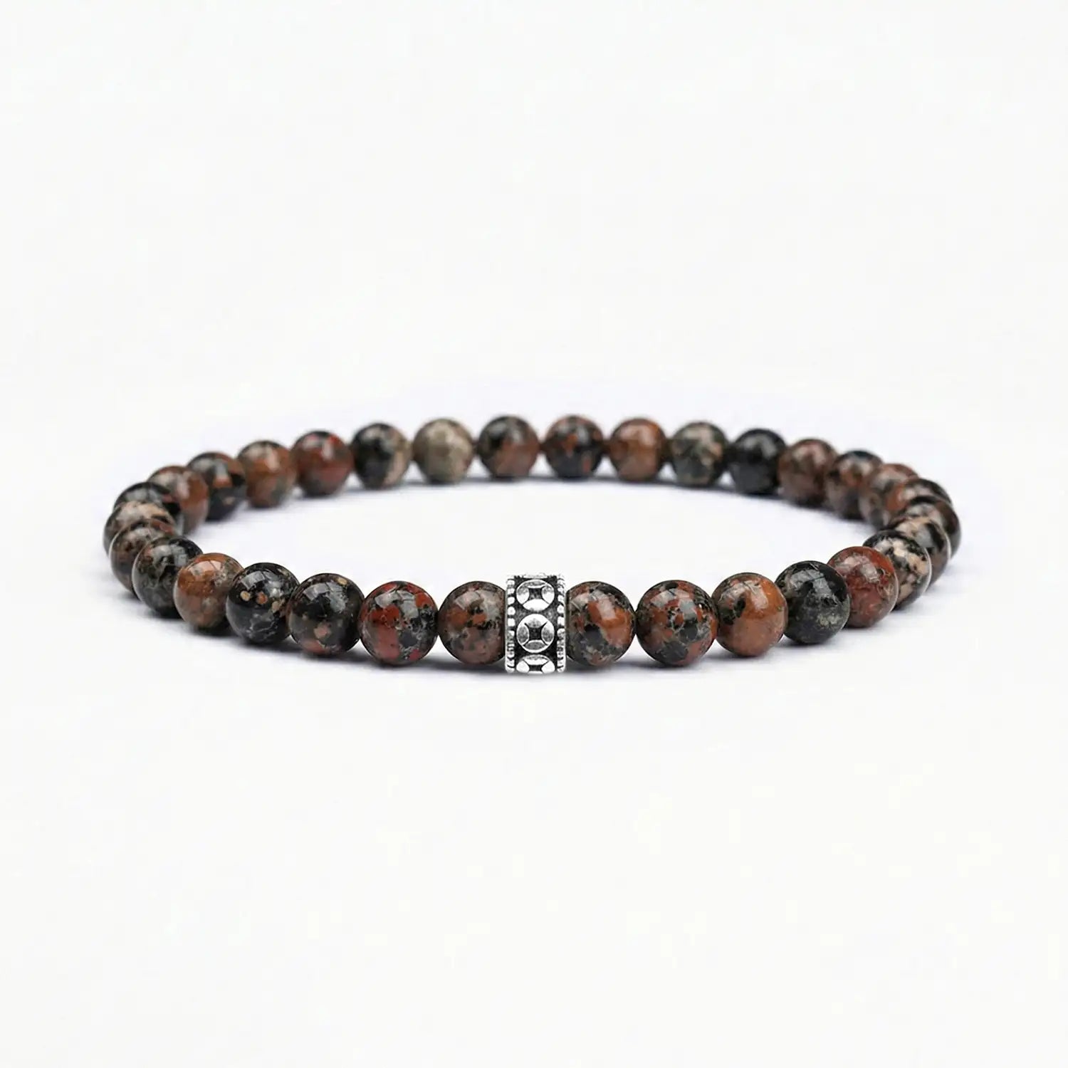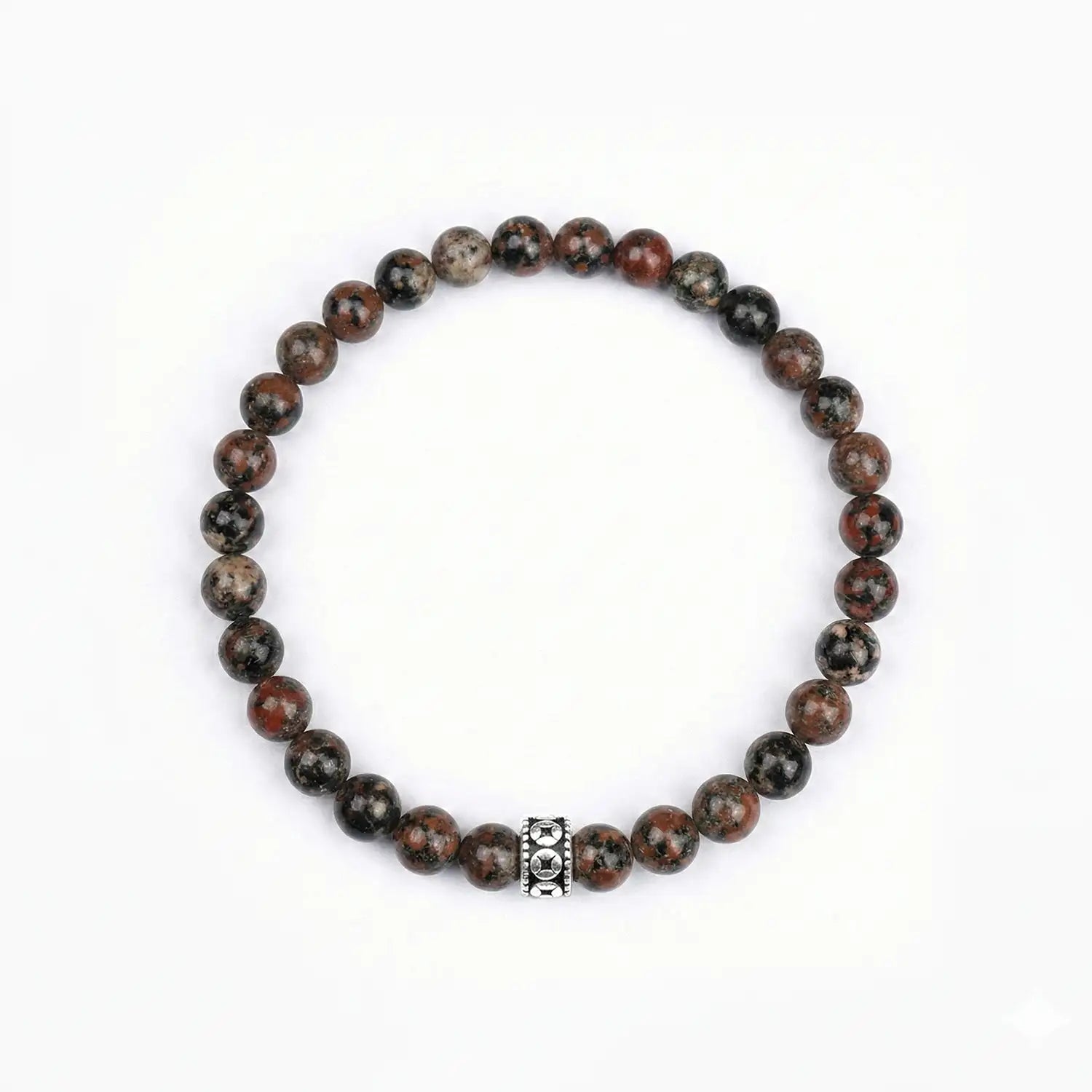 The refined middle ground—the 6mm bead offers a sophisticated, medium profile that is substantial enough to stand alone yet sleek enough to layer effortlessly. Blending hand-selected Red Snowflake Obsidian beads with 925 sterling silver detailing.
